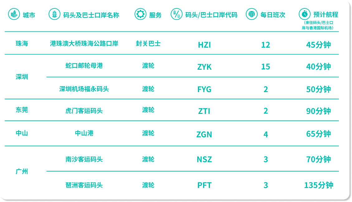 注意:旅客如乘坐航班抵达香港并转乘渡轮或封关巴士服务,必须在同一天完成转乘。次日转乘并不允许。