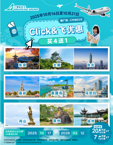 大湾区航空「Click & 飞优惠」单程/往返机票买4送1