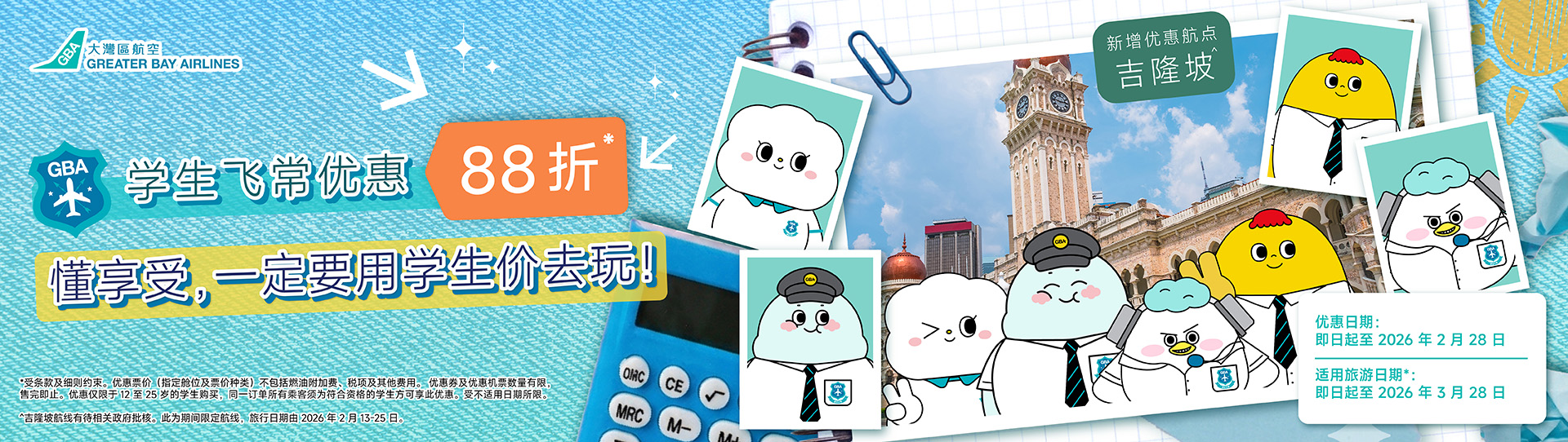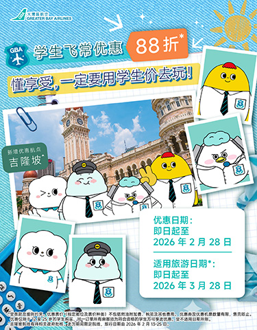 - 购买大湾区航空学生机票的乘客,必须提供有效之学生身份证明以便在机场柜位进行核实。未能提供有效学生证明文件及不符合学生资格的旅客,但希望乘搭同一航班,则需要另购买一张非学生优惠机票,并须视乎座位供应情况而定。