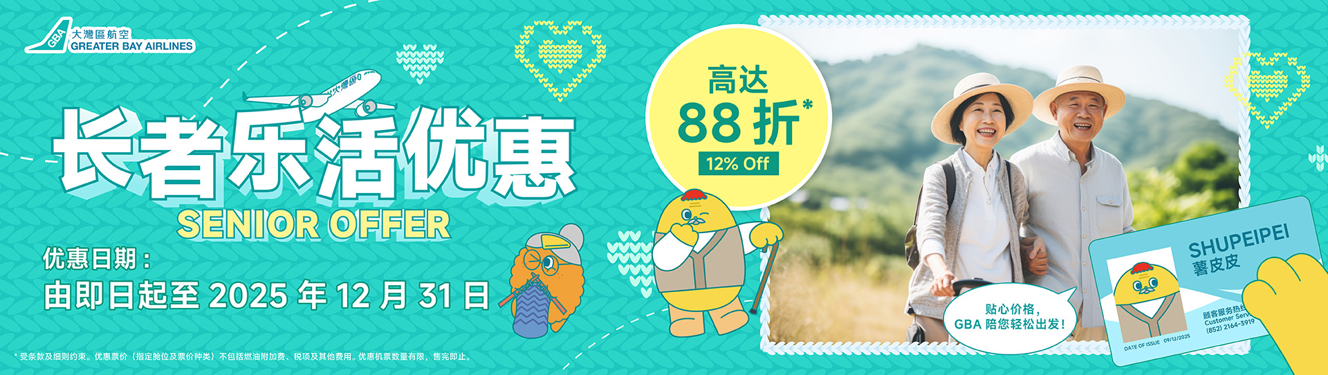 - 购买大湾区航空老年优惠机票的乘客,必须提供有效的身份证明以便在机场柜台进行核实。未能提供有效证明文件及不符合资格的旅客,但希望乘坐同一航班,则需要另购买一张非老年优惠机票,并须视乎座位供应情况而定。