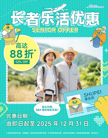 ^购买大湾区航空老年优惠机票的乘客,必须提供有效的身份证明以便在机场柜台进行核实。未能提供有效证明文件及不符合60岁或以上资格的旅客,但希望乘坐同一航班,则需要另购一张非老年优惠机票,并须视乎座位供应情况而定。