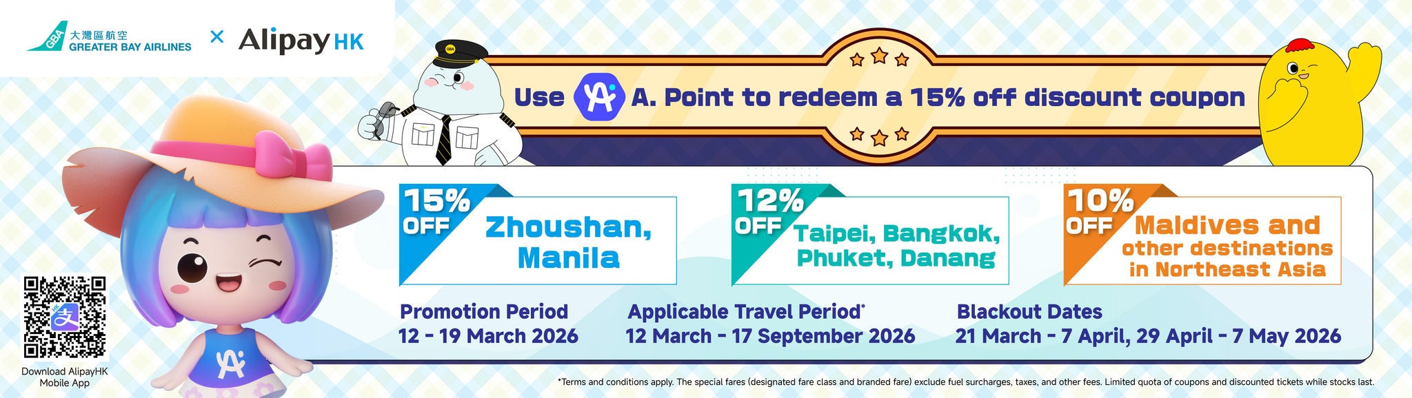 Greater Bay Airlines x AlipayHK|Redeem Up to 15% OFF Flight Coupon with A. Point
