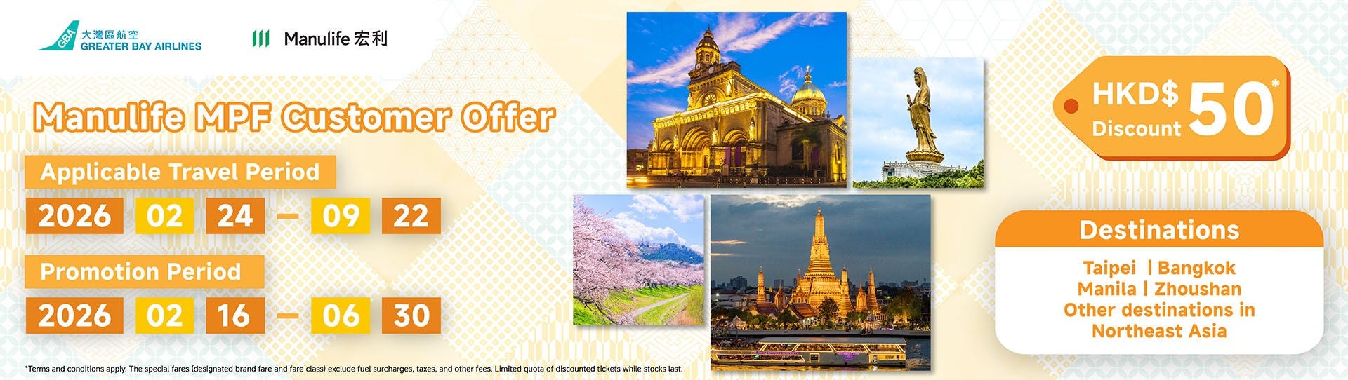 GBA X Manulife MPF Customer Offer|HK$50 off* round-trip tickets to designated destinations