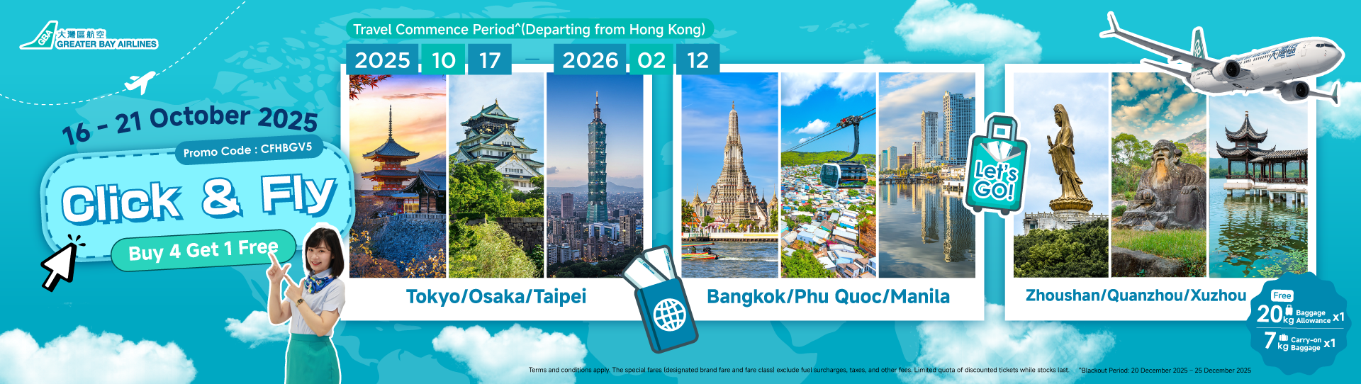 Greater Bay Airlines「Click & Book」Buy 4 Get 1 Free on one-way/round-trip tickets