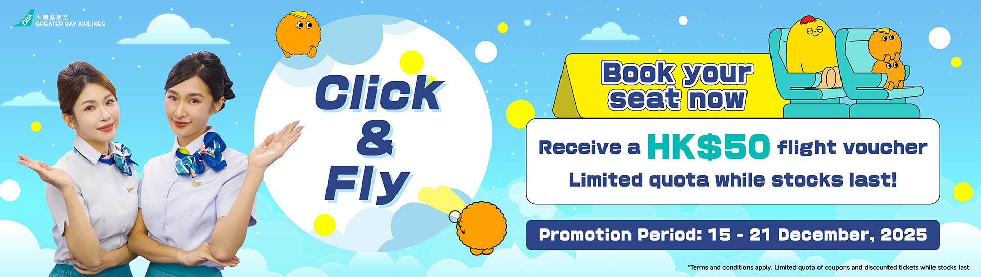 Greater Bay Airlines「Click & Fly」Book your seat now to receive a HK$50 flight voucher