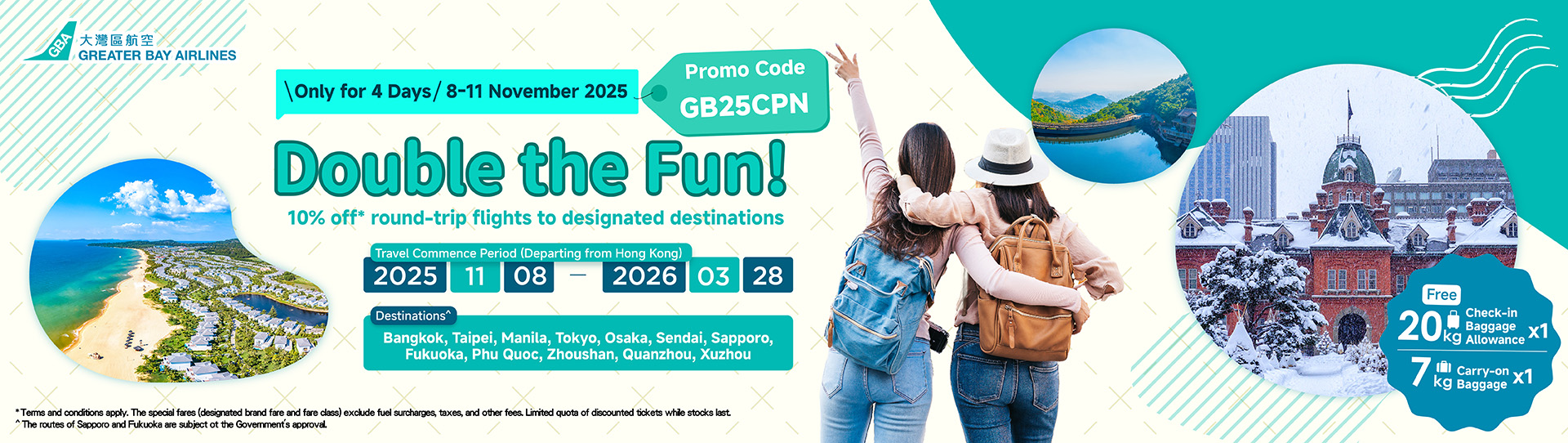 - The specified promotional code is only applicable for purchasing specified round-trip flights between Hong Kong to Bangkok, Taipei, Manila, Tokyo, Osaka, Sendai, Sapporo, Fukuoka, Phu Quoc Island, Zhoushan, Quanzhou, Xuzhou, operated by Greater Bay Airlines.