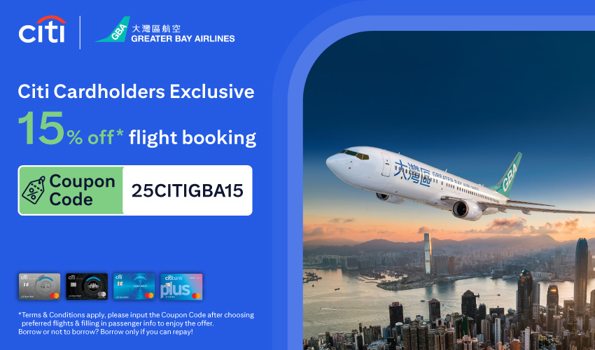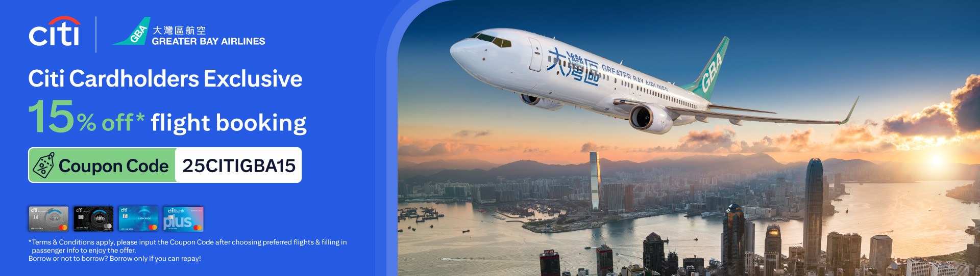 During the designated booking, Cardholders who book the round-trip flight ticket departing from Hong Kong to selected destinations below via official website or mobile application of Greater Bay Airlines with applicable Citi Credit Cards / Debit Cards / Commercial Cards, and enter the designated Coupon Code at checkout, will be entitled to 15% off discount offers: