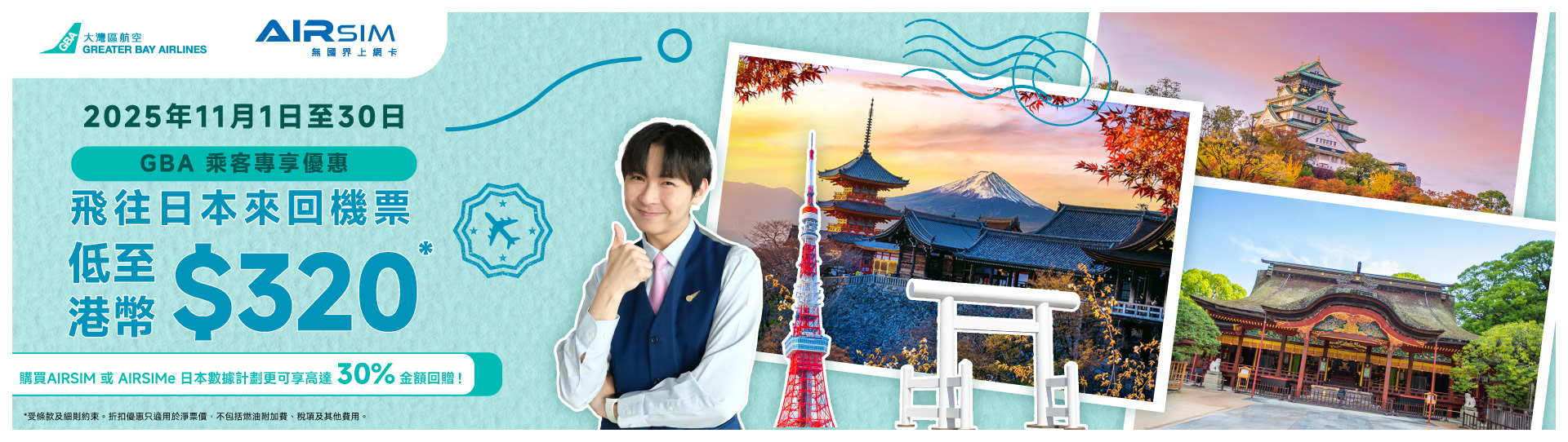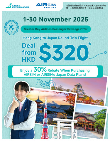 大灣區航空乘客專享優惠✈️ 飛往日本來回機票低至港幣$320*,購買AIRSIM 或 AIRSIMe 日本數據計劃更可享 30% 金額回贈!