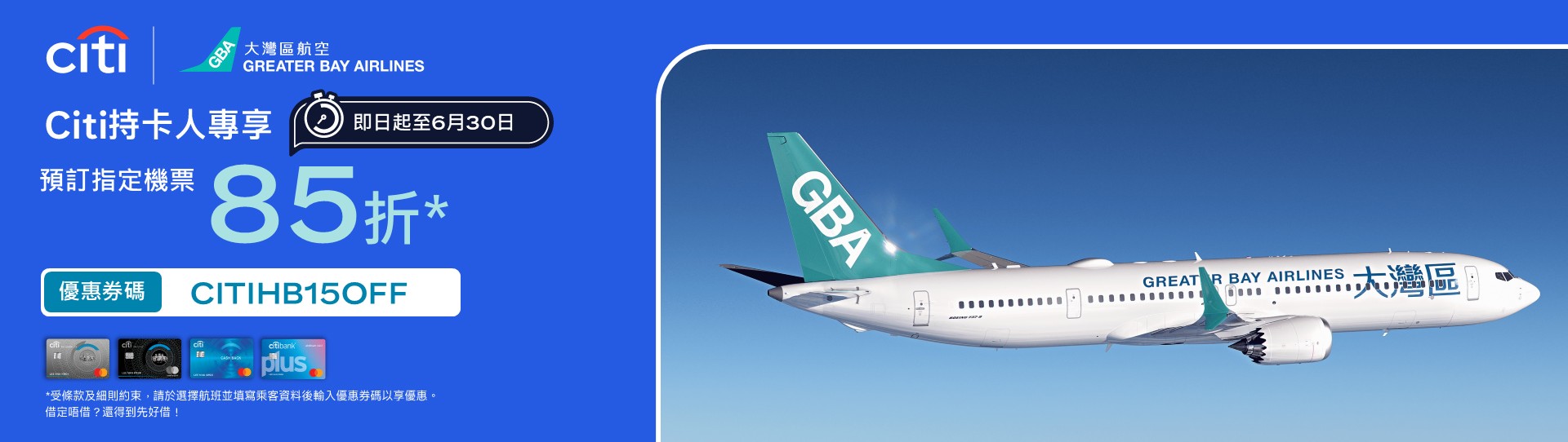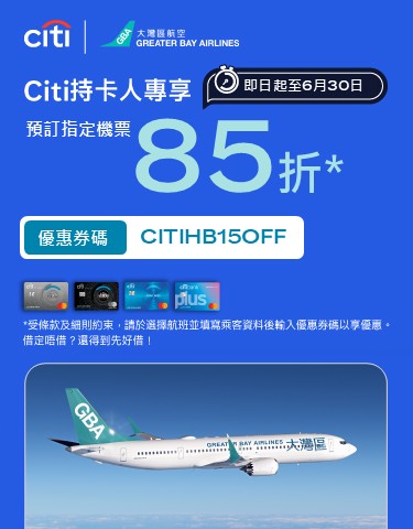 大灣區航空 X Citi卡 – 預訂香港至精選亞洲航點機票享85折優惠