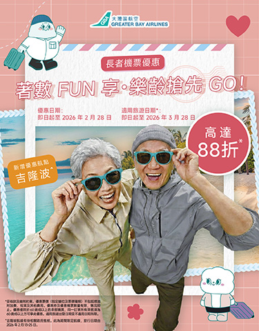 凡60歲或以上即可享88折*優惠預訂指定航線來回機票 | 立即領券
