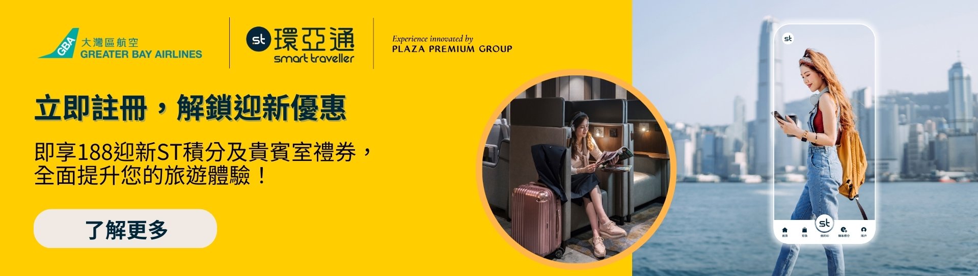 為慶祝與大灣區航空的合作,我們特別準備了專屬的註冊優惠!現在註冊成為環亞通會員,即可獲得 188 迎新 ST 積分,以及在環亞通app解鎖以下精選禮遇: