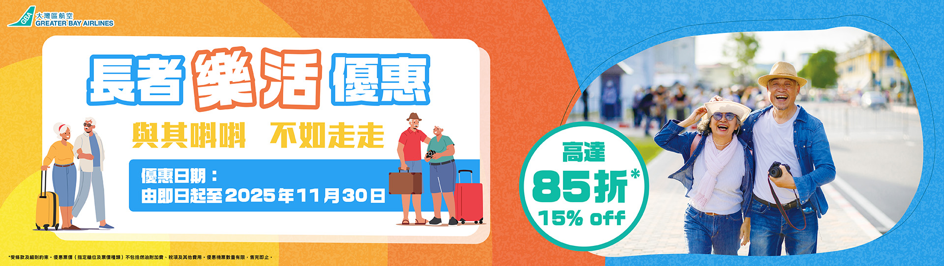 凡60歲或以上即可享85折*優惠預訂指定航線來回機票 | 立即領券