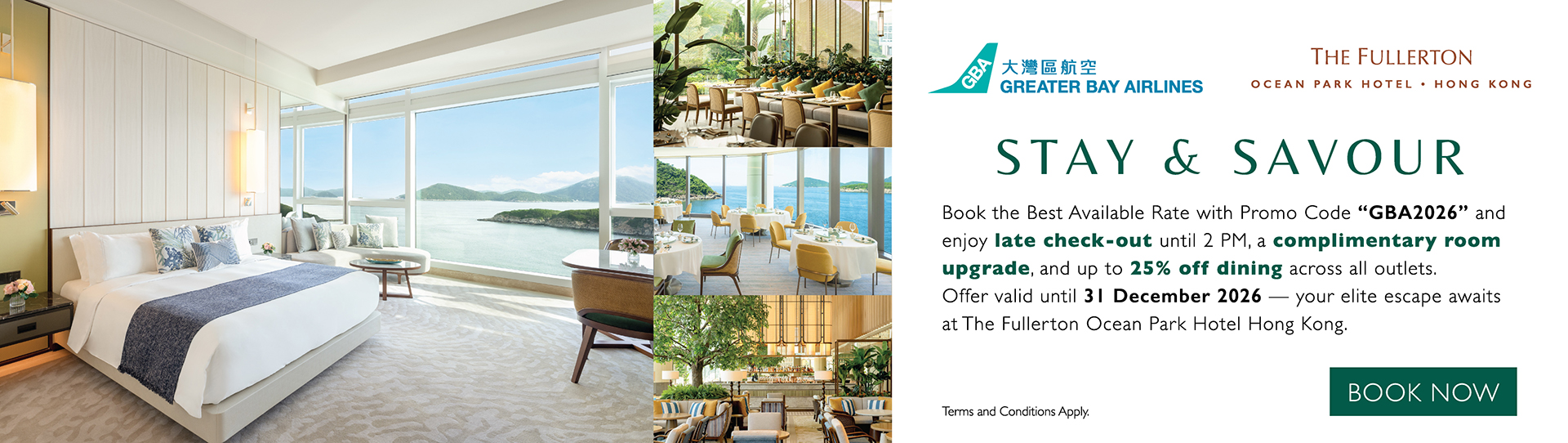Discover the vibrant charm of Hong Kong’s Southside at The Fullerton Ocean Park Hotel Hong Kong from now until 31 Dec, 2026 as a GBA Elite passenger.  Book the Best Available Rate using promo code 「GBA2026」and enjoy privileges, including complimentary late check-out until 2 pm and complimentary room upgrade for your next getaway.  Or visit the hotel with up to 25% dining discount to create cherished memories for you and your loved ones to share Official Website