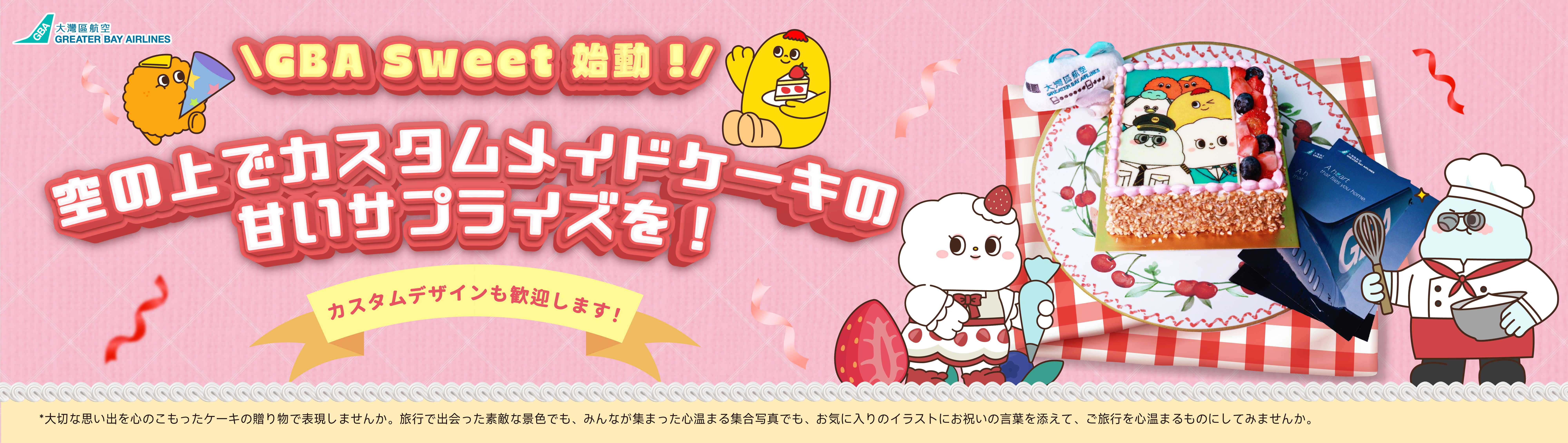 *利用規約が適用されます。オリジナルケーキサービスは、香港発の便でのみご利用できます。サービスは遅くとも出発の10日前までにご注文ください。予約完了後の払戻は致しかねます。ケーキの仕上がりイメージの事前送付は致しかねます。グレーターベイエアラインズはあらゆるお問い合わせに対する最終的な判断権を有します。
