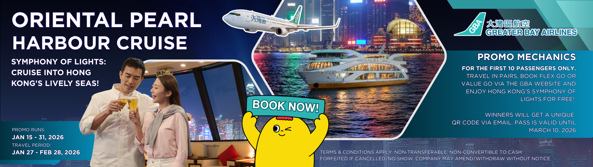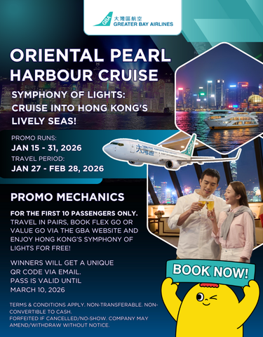 Greater Bay Airlines is launching a campaign to elevate your Hong Kong getaway with our exclusive promo! Book a Flex Go or Value Go fare for 2 or more passengers on the PH Website from January 15 to January 31 and get FREE Oriental Pearl Harbour Cruise tickets via the PH GBA website. Limited to the first 10 passengers only. Secure yours now for an unforgettable premium escape!