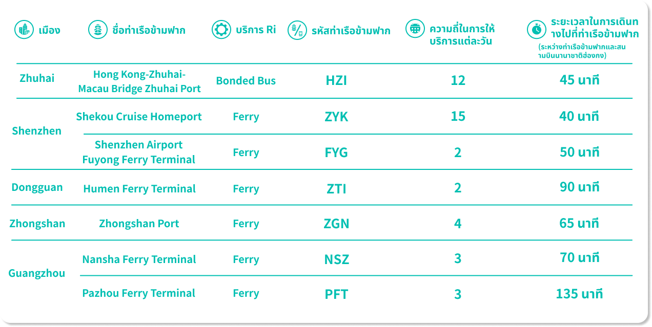 จากท่าเรือเฟอร์รี่: ผู้เดินทางควรมาถึงที่ท่าเรือก่อนเวลาที่กำหนดสำหรับการออกเดินทางของเรือเฟอร์รี่ 60 นาที กรุณานำบัตรโดยสาร "เดินทางผ่านฮ่องกง" เอกสารการเดินทาง และวีซ่าเข้าหรือผ่านแดนที่ยังไม่หมดอายุ (ถ้ามี) มาแสดง บริษัทเรือเฟอร์รี่จะออกตั๋วเรือและบัตรขึ้นเครื่องสำหรับการเดินทางของคุณ จากนั้นขึ้นเรือเฟอร์รี่ไปยังสนามบินนานาชาติฮ่องกง เมื่อถึงฮ่องกงแล้ว โปรดไปที่ประตูขึ้นเครื่องเพื่อเดินทางต่อไปยังจุดหมายปลายทางของคุณ