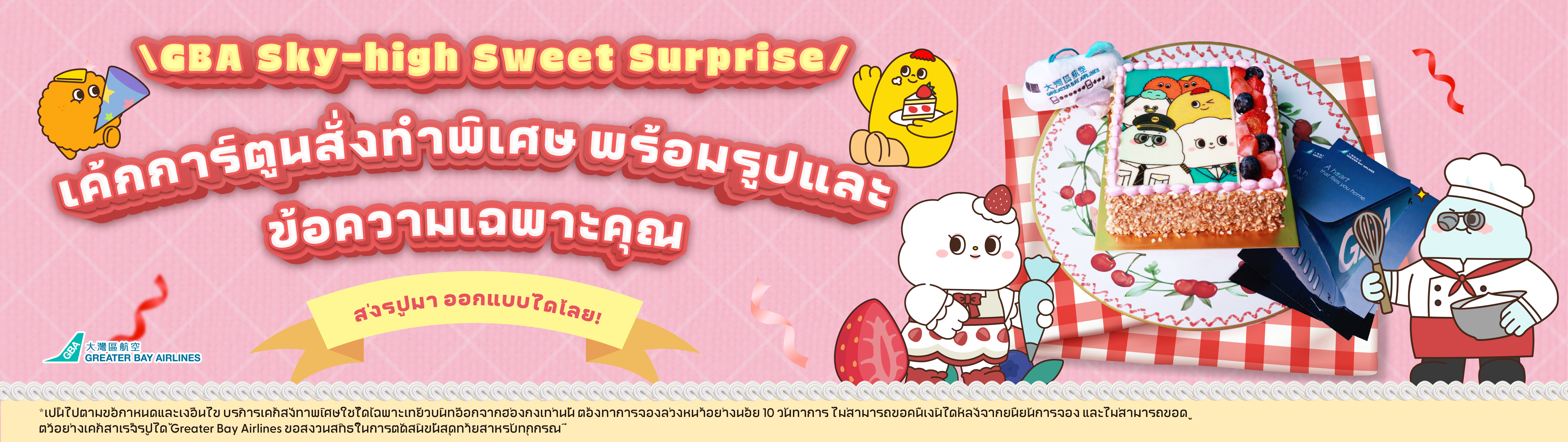 * เป็นไปตามข้อกำหนดและเงื่อนไข บริการเค้กสั่งทำพิเศษใช้ได้เฉพาะเที่ยวบินที่ออกจากฮ่องกงเท่านั้น ต้องทำการจองล่วงหน้าอย่างน้อย 10 วันทำการ ไม่สามารถขอคืนเงินได้หลังจากยืนยันการจอง และไม่สามารถขอดูตัวอย่างเค้กสำเร็จรูปได้ Greater Bay Airlines ขอสงวนสิทธิ์ในการตัดสินขั้นสุดท้ายสำหรับทุกกรณี