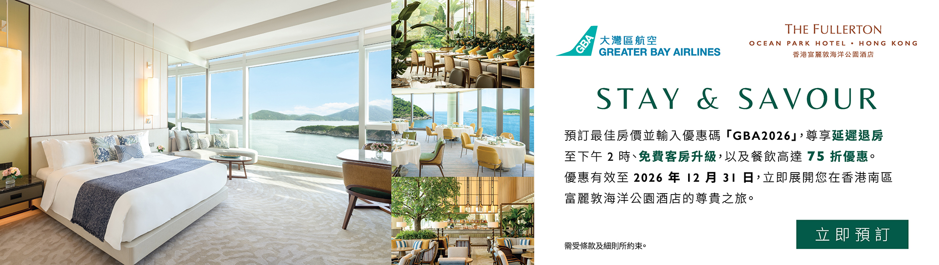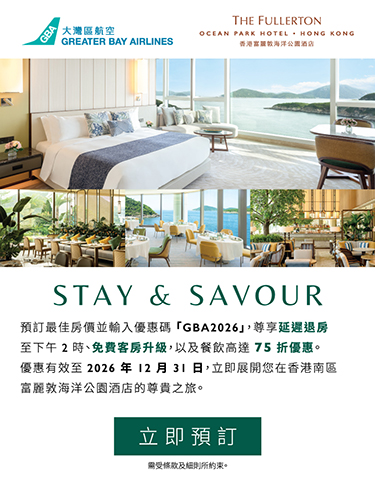 於香港富麗敦海洋公園酒店陶醉在香港南區的迷人魅力中,探索饒富趣味的歷史與自然景致,享受動人難忘的度假時光。憑優惠代碼 「GBA2026」以最優惠房價預訂入住,即可尊享專為大灣區航空旅客而設的Stay & Savour 住宿禮遇;蒞臨酒店享用海畔餐饕,更可尊享低至75折用餐優惠,讓您旅程更添難忘。