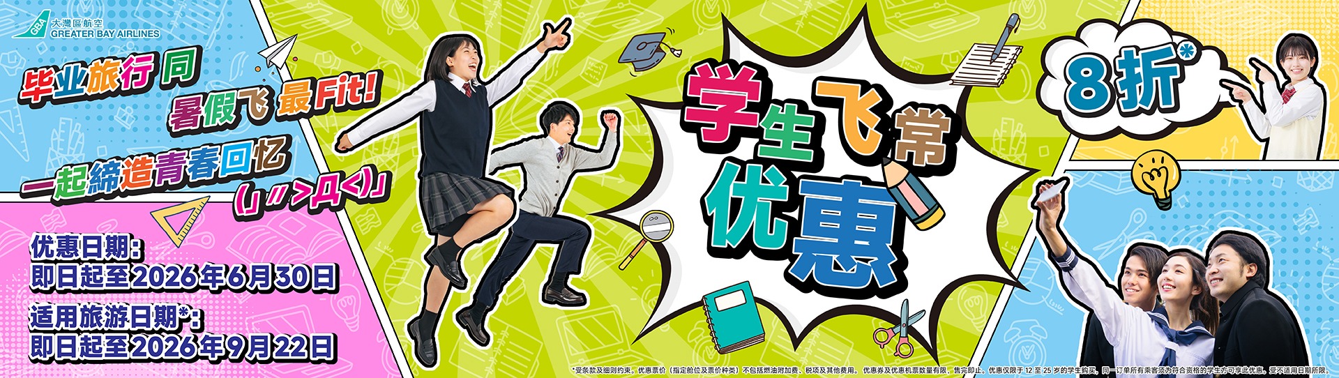 - 购买大湾区航空学生机票的乘客,必须提供有效之学生身份证明以便在机场柜位进行核实。未能提供有效学生证明文件及不符合学生资格的旅客,但希望乘搭同一航班,则需要另购买一张非学生优惠机票,并须视乎座位供应情况而定。