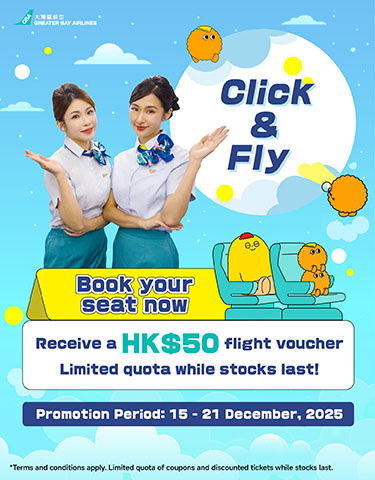 From December 15 to December 21, 2025, book tickets for designated travel dates and pre-purchase your seat to receive a HK$50 flight voucher per passenger. The voucher can be used for your next ticket booking.