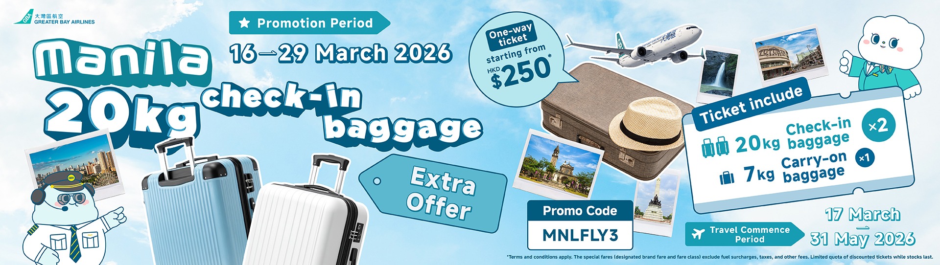 From 16 - 29 March 2026, simply enter the designated promo code 【MNLFLY3】 when booking one-way or round-trip tickets from Hong Kong to Manila through Greater Bay Airlines' official channels (website or mobile app) to enjoy 1 extra piece of 20kg free check-in baggage allowance (Total of 2 pieces of 20kg check-in baggage allowance)