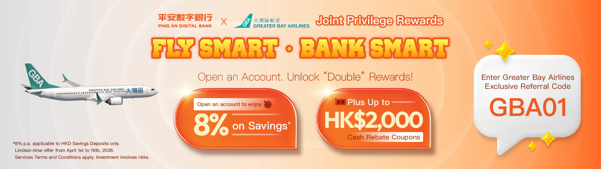 New customers^ who successfully open Ping An Digital Bank (the “Bank”) Savings Deposit and investment account with the Greater Bay Airlines exclusive referral code "GBA01" can enjoy an 8% p.a. HKD savings interest rate, Cash Rebate Coupons worth up to HK$ 2,000 (including Stock Cash Rebate Coupon, Fund Cash Rebate Coupon, and Stock “Cash Back Per Transaction” Coupon), as well as FX at Bank Cost Rate, making every step smarter from tickets booking to departure.
