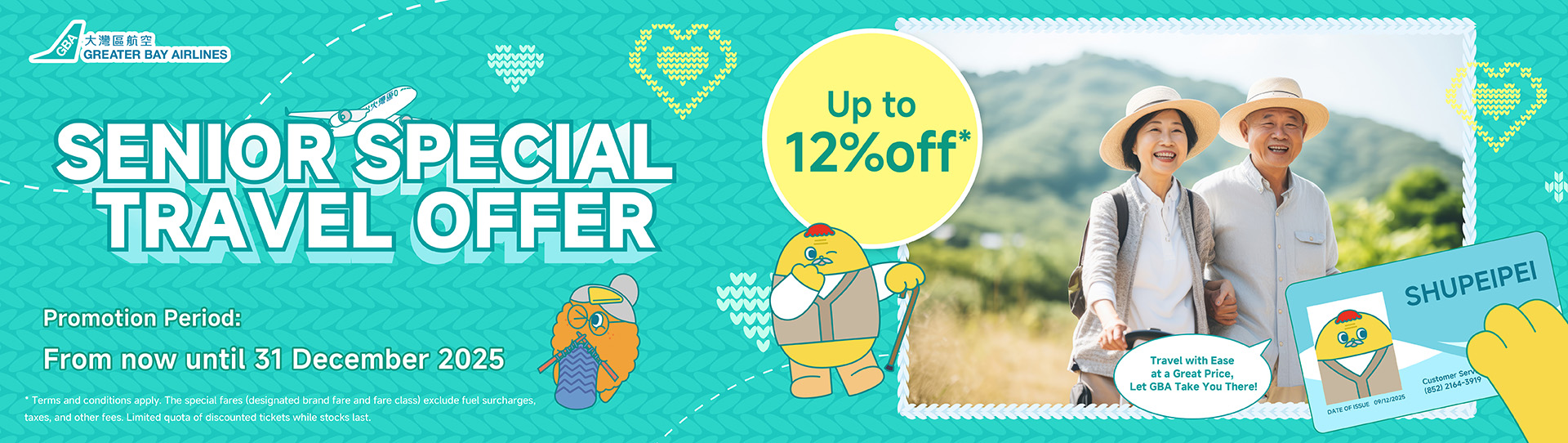 ^Passengers purchasing Greater Bay Airlines senior citizen discount tickets must provide valid proof of their identity for verification at the airport counter. If passengers are unable to provide valid documentation upon request and do not meet the age requirment of 60 or above, but wish to travel on the same flight, they will need to purchase a new standard fare ticket, which is subject to seat availability.