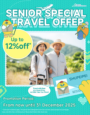 Passengers aged 60 or above can enjoy a 12% discount* for booking round-trip tickets on designated routes | Grab your coupon now
