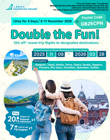 - The specified promotional code is only applicable for purchasing specified round-trip flights between Hong Kong to Bangkok, Taipei, Manila, Tokyo, Osaka, Sendai, Sapporo, Fukuoka, Phu Quoc Island, Zhoushan, Quanzhou, Xuzhou, operated by Greater Bay Airlines.