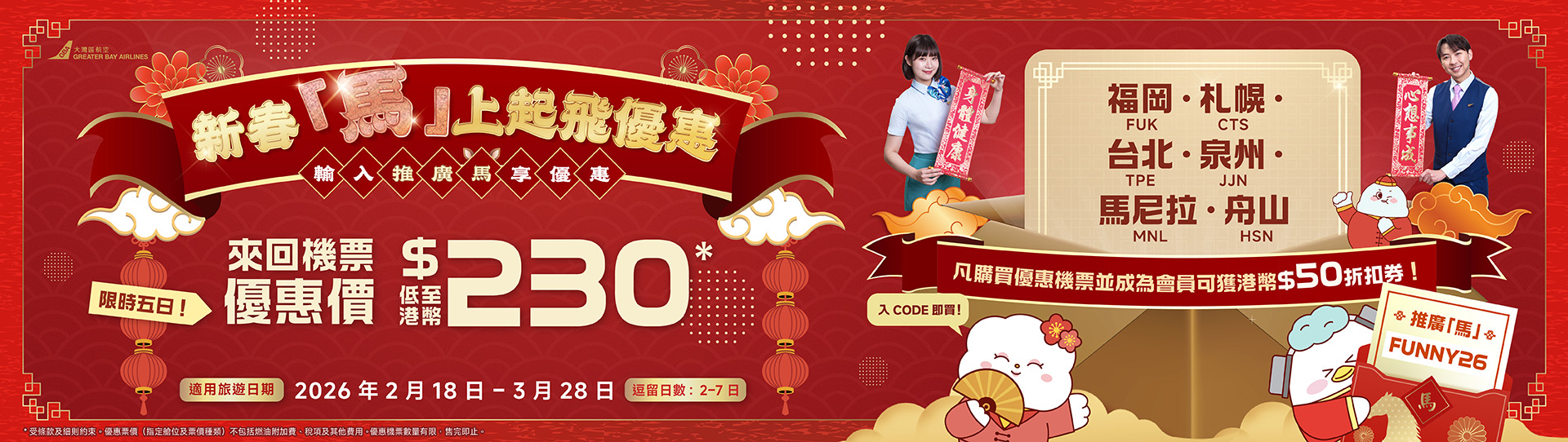 由 2026 年 2 月 6 日 至 2 月 10 日,輸入指定推廣碼【FUNNY26】預訂指定航點來回機票可享低至港幣$230*,機票包含1件7公斤手提行李及1件20公斤託運行李。立即搶機票!