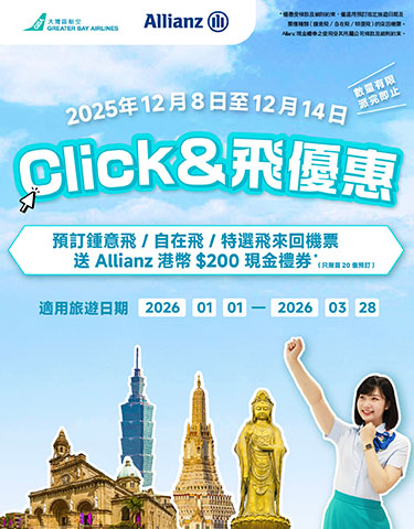大灣區航空「Click & 飛優惠」 送Allianz港幣$200現金禮券