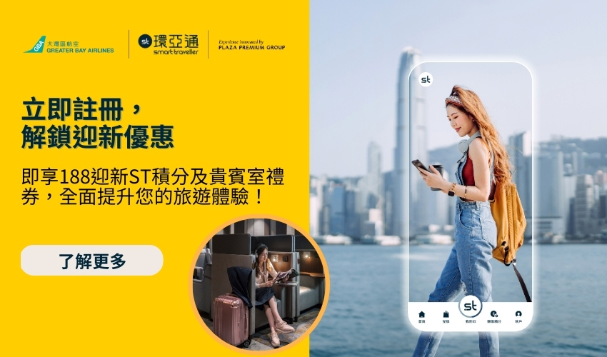 為慶祝與大灣區航空的合作,我們特別準備了專屬的註冊優惠!現在註冊成為環亞通會員,即可獲得 188 迎新 ST 積分,以及在環亞通app解鎖以下精選禮遇: