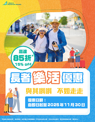 凡60歲或以上即可享85折*優惠預訂指定航線來回機票 | 立即領券