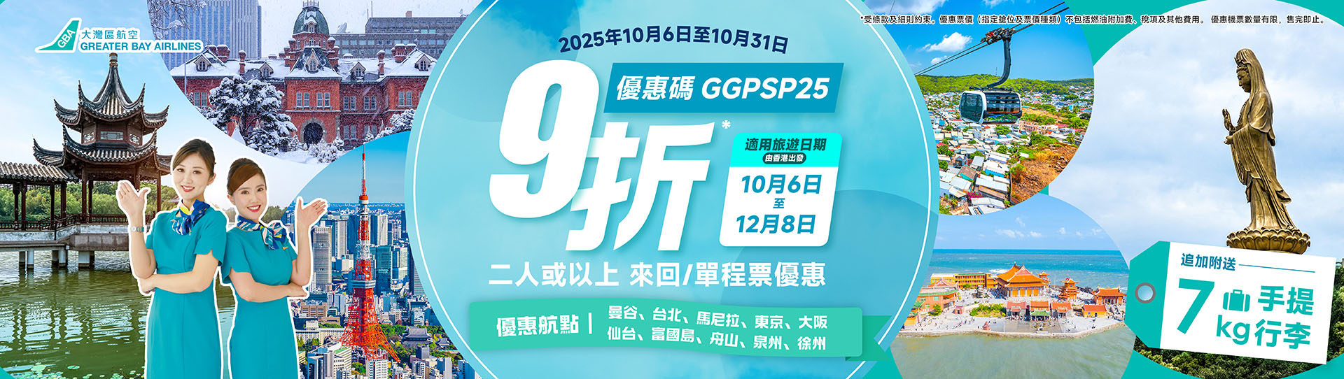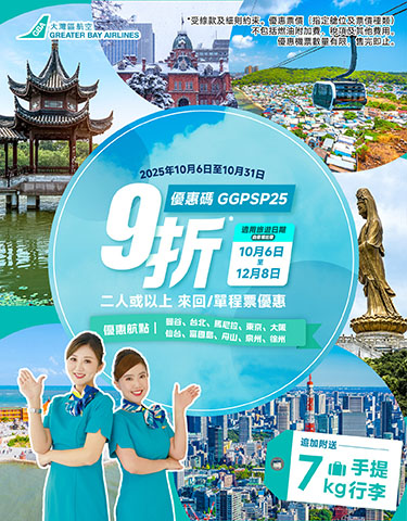 由 2025 年 10 月 6 日 至 2025 年 10 月 31 日,輸入指定推廣碼【GGPSP25】預訂二人或以上來回或單程優惠飛票價機票即享9折*優惠。