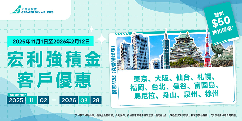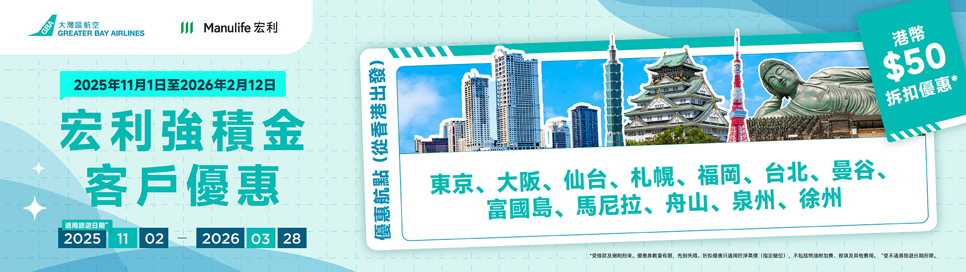 由 2025 年 11 月 1 日 至 2026 年 2 月 12 日,您可以在 Manulife HK 手機應用程式中兌換港幣$50優惠券,於大灣區航空網站或手機應用程式預訂指定航點(東京、大阪、仙台、札幌、福岡、台北、 曼谷、富國島、馬尼拉 、舟山 、泉州及徐州)來回機票即減港幣$50!