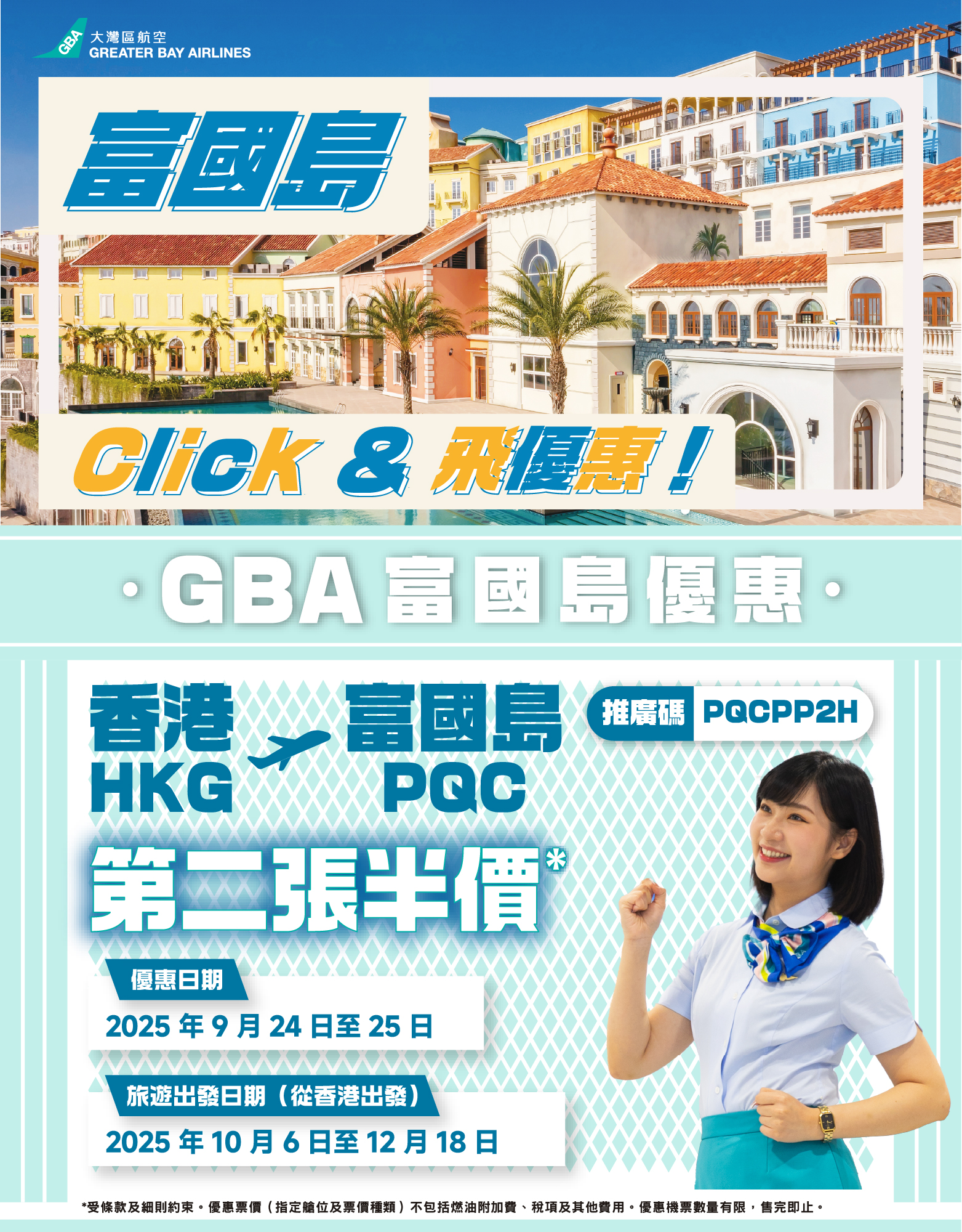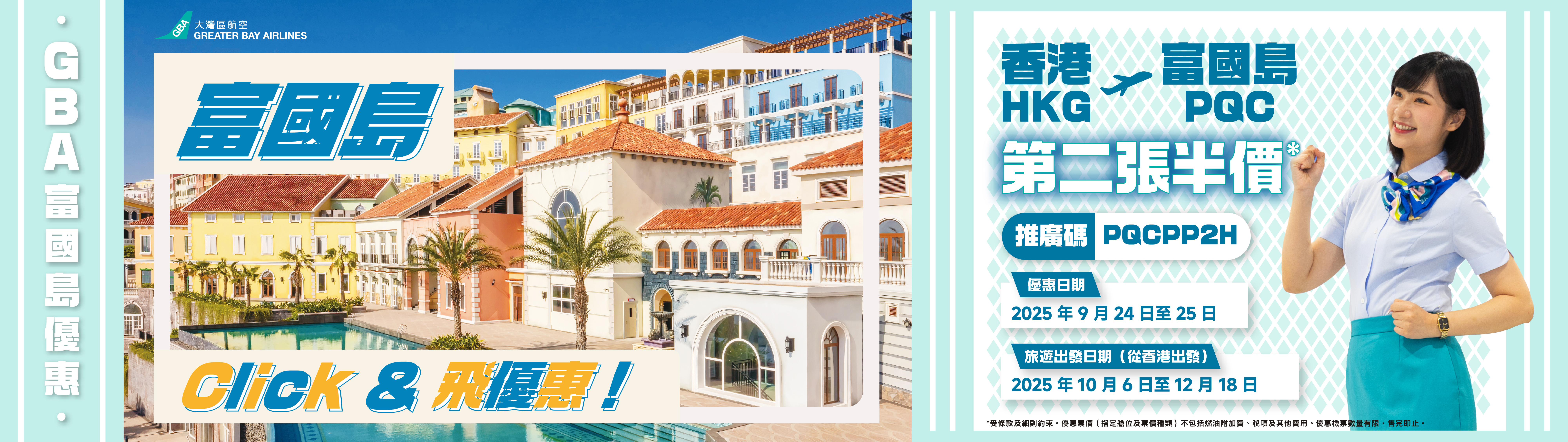 2025 年 9 月 24 日 至 2025 年 9 月 25 日,輸入指定推廣碼^【PQCPP2H】預訂富國島來回/單程機票可享「第二張半價」,單程淨票價平均每人低至港幣$120*。立即預訂!