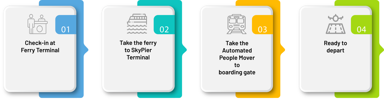 Minimum connecting Time (MCT): Arriving at Skypier Terminal at 80 mins before your scheduled flight departure time if boarding pass has been obtained at ferry port, whilst 110 mins if boarding pass required to obtain upon arriving at Skypier Terminal.
