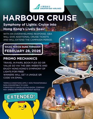 Greater Bay Airlines is launching a campaign to elevate your Hong Kong getaway with our exclusive promo! Book a Flex Go or Value Go fare for 2 or more passengers on the PH Website until February 28, 2026 and get FREE Oriental Pearl Harbour Cruise tickets via the PH GBA website. Limited to the first 10 passengers only. Secure yours now for an unforgettable premium escape!