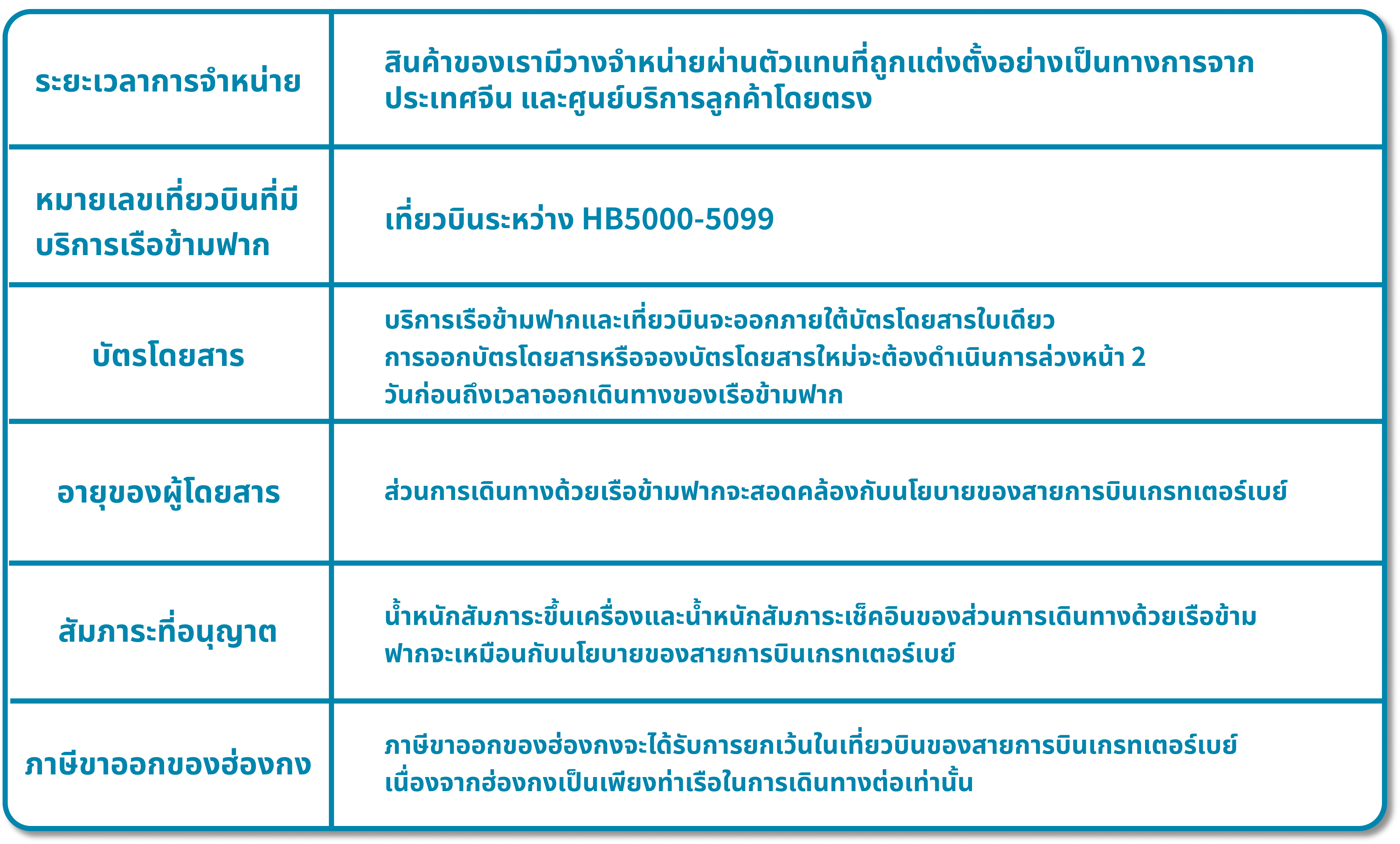 "ค่าบริการกระเป๋าล่วงหน้า" ไม่สามารถใช้ได้กับผลิตภัณฑ์ "เดินทางผ่านฮ่องกง" ค่าธรรมเนียมกระเป๋าสัมภาระเกินจะถูกเรียกเก็บโดยสายการบินเขตอ่าวใหญ่ (GBA) ที่สนามบินหรือที่ท่าเรือเฟอร์รี่