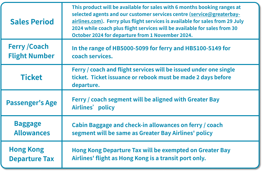 - Passengers are advised to allocate ample time for transitioning between flight and ferry / coach services. In cases of delays, cancellations, or rerouting that result in passengers missing their connecting ferry, coach or flight, the terms and conditions outlined by Greater Bay Airlines and the passenger notice issued by Chu Kong Passenger Transport Company Limited will be applicable.