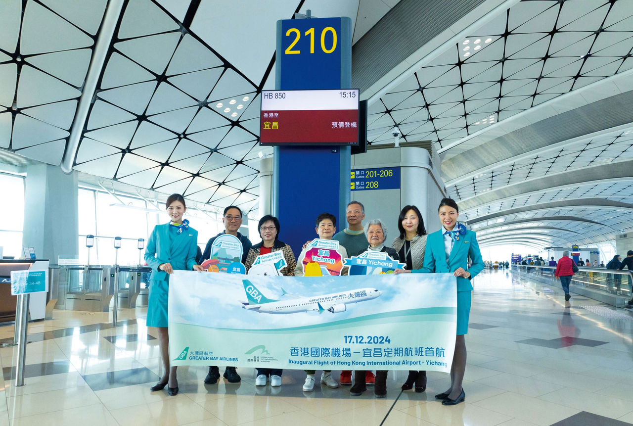 (2024年12月17日)大灣區航空的湖北省宜昌市定期航班今天正式投入服務,進一步開拓其內地飛行網絡;該公司早前剛推出了舟山及黃山航線。今午乘客登機出發前,大灣區航空行政總裁吳秀蘭女士親臨香港國際機場送行。此新航線每星期提供3班直航航班(逢星期二、四、日),旅客現在前往長江三峽等著名景點遊覽,倍感方便。